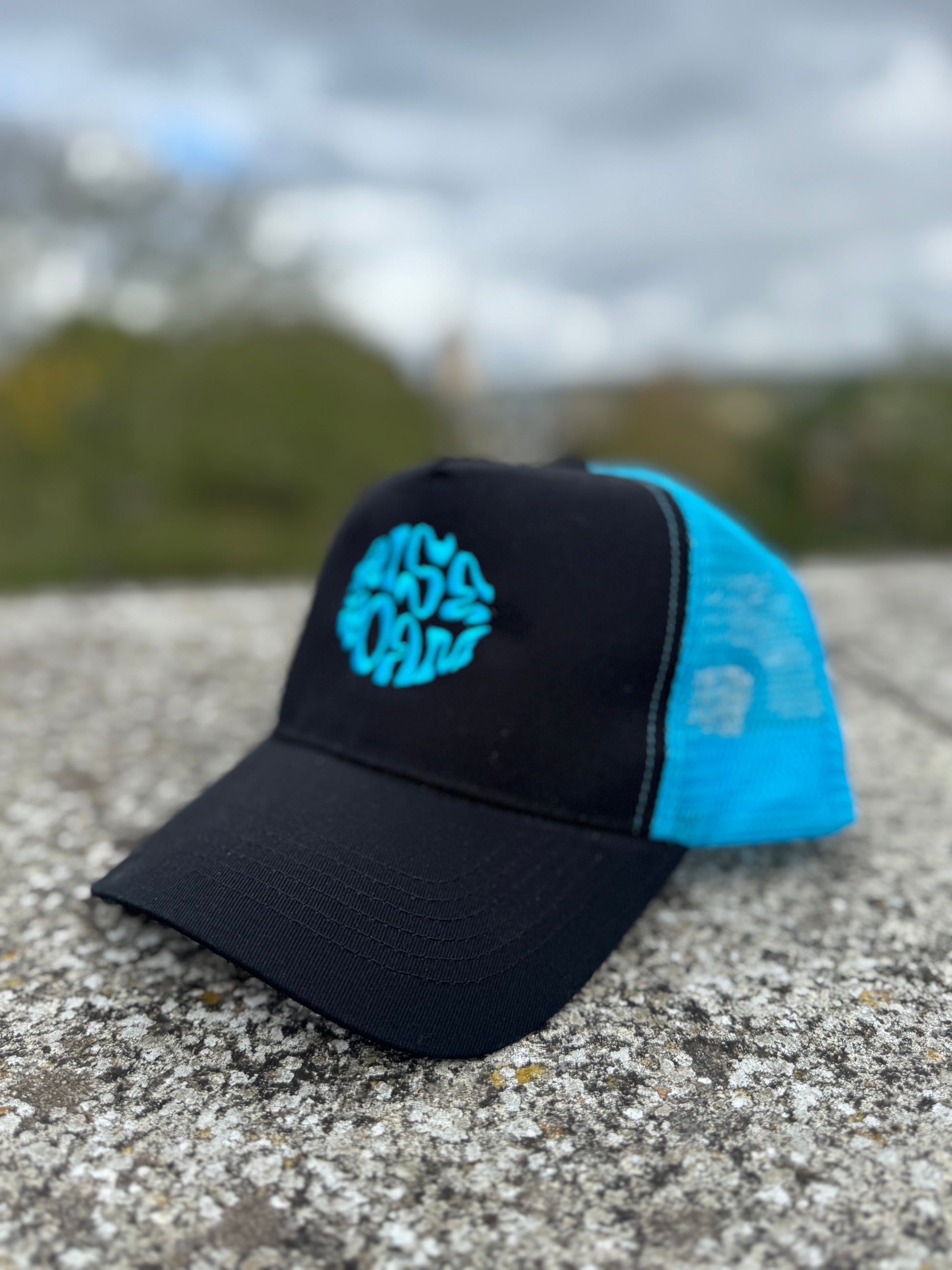 Rise & Roam Brand - Vibrant Blue Squiggle Trucker Cap.